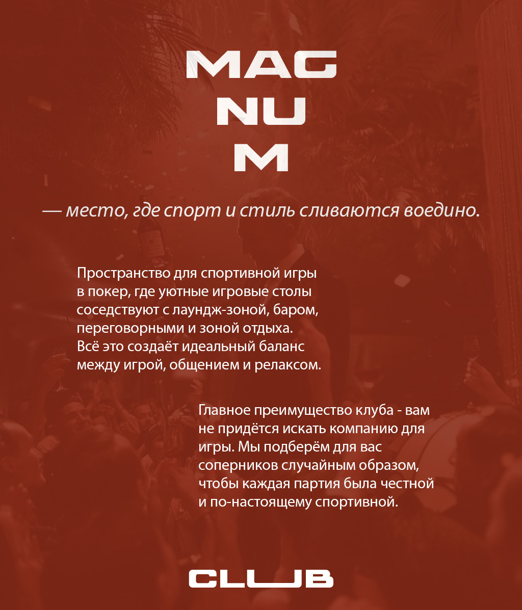 Magnum Club — пространство спортивного покера в Москве. Здесь нет денежных ставок и выигрышей: только фишки, турнирные сетки и честные правила.
